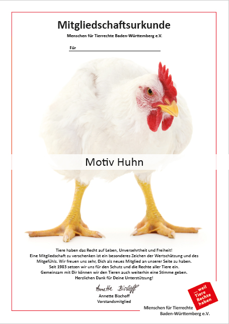 Wenn Sie eine Mitgliedschaft verschenken möchten, können Sie das unter folgendem Link machen. Bitte tragen Sie ihren eigenen Namen ein. In dem Feld "Nachricht" dann bitte, das Wort "Geschenkmitgliedschaft", den Namen der beschenkten Person und das gewünschte Motiv (Schweinchen, Taube, Familie Huhn etc.). Wir schicken Ihnen dann das PDF mit dem Namen der Person zu, sodass Sie es selbst ausdrucken können bzw. als PDF via E-Mail an den*die Beschenkte*n weiterleiten können.