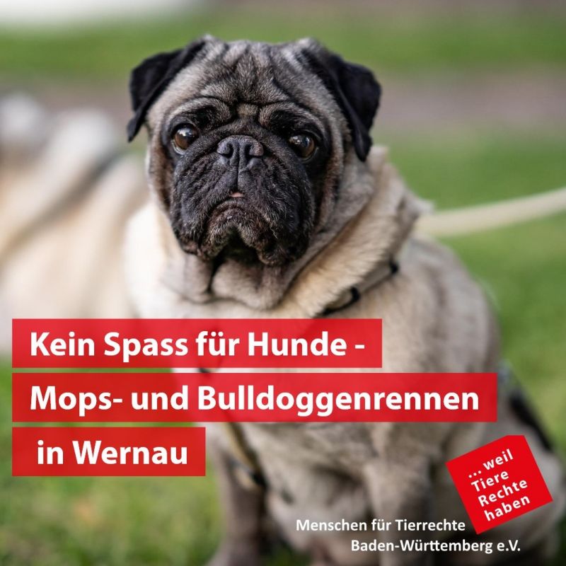 Wernau / Stuttgart, 2. September 2022 - Am bevorstehenden Wochenende findet zum wiederholten Mal das Mops- und Bulldoggenrennen in Wernau statt. Diese Hunderassen sind dafür bekannt, schon unter „normalen Bedingungen“ schwer Luft zu bekommen. Menschen für Tierrechte Baden-Württemberg e.V. appelliert daher an das Verantwortungsbewusstsein der Hundehalter*innen, ihre Tiere nicht an den Start und damit nicht unnötig in Lebensgefahr zu bringen.