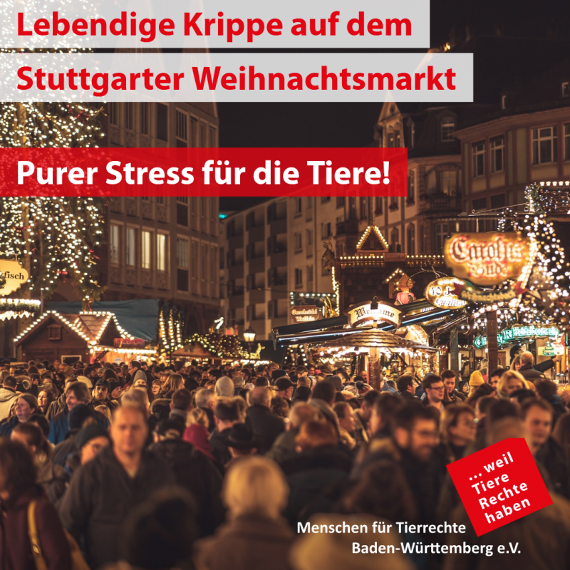 Das deutsche Tierschutzgesetz besagt, dass Personen, die Tiere halten oder betreuen, dafür verantwortlich sind, diese entsprechend angemessen zu ernähren, pflegen und verhaltensgerecht unterzubringen. Außerdem muss jedes Tier die Möglichkeit haben, sich artgemäß zu bewegen. „Ein Zur-Schau-stellen, wie auf dem Stuttgarter Weihnachtsmarkt, dürfte nicht erlaubt werden, da die tier-und verhaltensgerechte Unterbringung nicht gewährleistet werden kann “, so Stephanie Kowalski, Tierärztin und Wissenschaftliche Mitarbeiterin beim Verein Menschen für Tierrechte Baden-Württemberg. „Nicht nur, dass die dort eingepferchten Tiere meist viel zu wenig Bewegungs-, und Rückzugsmöglichkeiten haben, oft werden sie von den Weihnachtsmarktgäste mit Lebkuchen, Pommes & Co gefüttert, was zu gesundheitlichen Problemen, wie Pansenacidosen und Koliken bis hin zu Todesfällen führen kann. Nicht zuletzt besteht leider immer die Gefahr, dass angetrunkene Besucher*innen den Tieren „aus Spaß“ Leid zufügen, indem sie sie beispielsweise freilassen, im Gehege umher jagen, versehentlich das Stroh in Brand setzen oder ähnliches.“