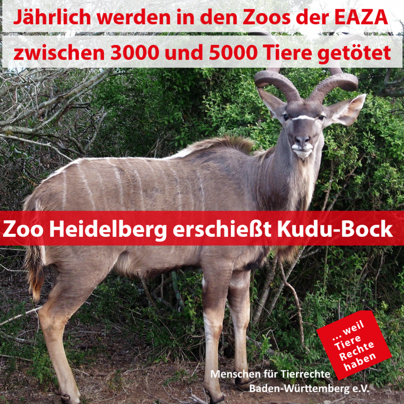 Der Zoo Heidelberg hat seine Kudu-Herde aufgelöst. In der Pressemitteilung vom Zoo hieß es dazu: ,,Mitte Februar hat das letzte Mitglied der Großen Kudu-Herde den Zoo verlassen" (1). Das ist eine blumige Umschreibung, denn dieses letzte Mitglied wurde per Kopfschuss getötet und an die Raubtiere verfüttert. Der Zoo beschrieb den Vorgang in einer weiteren Pressemitteilung wie folgt: ,,In Abstimmung mit allen Verantwortlichen seitens Zoo und Zuchtbuch wurde die schwere Entscheidung getroffen, den Kudu-Bock zu töten und als Futtertier an die Löwen und Tiger zu verfüttern. Die Tötung erfolgte auf eine möglichst stressfreie Art und Weise: Das Tier wurde in seinem gewohnten Umfeld mit einem gezielten Schuss getötet" (1).