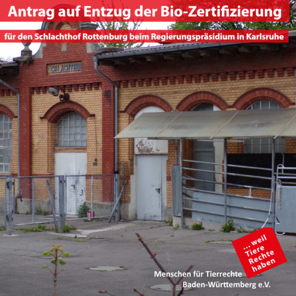 Der Verein Menschen für Tierrechte Baden-Württemberg e. V. stellte am 05.04.2024 einen Antrag auf Entzug der Bio-Zertifizierung (Art. 35 Abs. 1 der EU-VO 2018/848) für den Schlachthof Rottenburg beim Regierungspräsidium in Karlsruhe. Der Antrag bezieht sich auf das Gutachten der Firma Falkenstein, das erhebliche Mängel in fast allen Bereichen der Schlachtstätte auflistet.