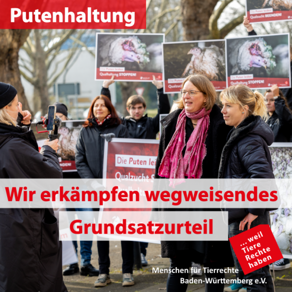 Am 7. März 2024 fand vor dem Verwaltungsgerichtshof Mannheim die weitere Verhandlung der Puten-Klage von Menschen für Tierrechte Baden-Württemberg statt. Innerhalb dieser Verhandlung wurden schockierende Details aus der Putenhaltung öffentlich. Kurz vor der Besichtigung durch die Gutachter fand ein größeres Beschädigungspicken statt, bei welchem 20 Tiere trotz gekürzter Schnäbel starben. Bei Einzeltieren konnten die Gutachter noch Spuren dieses Vorfalls erkennen. Bei der Planung der Besatzdichte im Stall plant der Landwirt immer 200 bis 300 Tiere ein, die nicht zur Mast genutzt und vorab getötet werden. Das sind kleine und schwächere Tiere sowie weibliche Tiere, die fehlerhaft einsortiert wurden. Der Betrieb mästet nämlich ausschließlich männliche Tiere. Für die 5.900 Puten im Betrieb gibt es vier Strohballen Beschäftigungsmaterial. Der vom Gericht geladene Gutachter bezeichnete die Haltung als akzeptabel, warf aber gleichzeitig ein, dass die Putenhaltung ein rechtsfreier Raum ist.