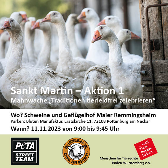 Vertreter*innen und Unterstützer*innen der Tierrechtsorganisationen Menschen für Tierrechte Baden-Württemberg, PETA und Animal Save halten am Samstag, den 11. November 2023 von 9 bis 9:45 Uhr eine friedliche Mahnwache bei den Gänsen und Schweinen des Geflügelhof Maier Remmingsheim (https://www.maier-gefluegelhof.de/).Adresse für Anfahrt: Blüten Manufaktur, Eratskirche 11, 72108 Rottenburg am Neckar. Von dort sind es fünf Minuten Fußweg zu den Gänsen und Schweinen. Anschließend geht es weiter zum Hofladen (Brühlstraße 8 in 72149 Neustetten). Vor diesem wird von 10:15 bis 13 Uhr demonstriert. Es wird Redebeiträge geben und Interessierte als auch die Presse sind eingeladen, die Veranstaltung zu unterstützen oder darüber zu berichten.