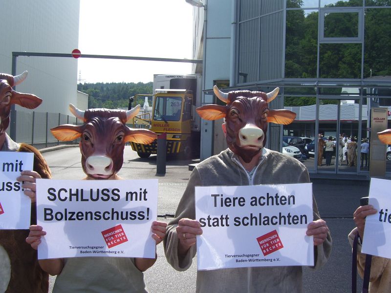 Wir unterstützen die internationale Kampagne Schließung aller Schlachthäuser, die von der Organisation L214 ins Leben gerufen wurde und organisieren diesbezüglich auch immer wieder Aktionen vor Schlachthäusern. Trotz zahlloser gewichtiger ethischer Argumente ist ein Ende des Schlachtens derzeit aber weder politisch noch gesellschaftlich durchsetzbar. Um dennoch möglichst vielen Tieren Schmerzen und Leiden zu ersparen, setzen wir uns daher auch dafür ein, dass die Fehlbetäubung von Millionen Tieren im Jahr in deutschen Schlachthöfen beendet wird.