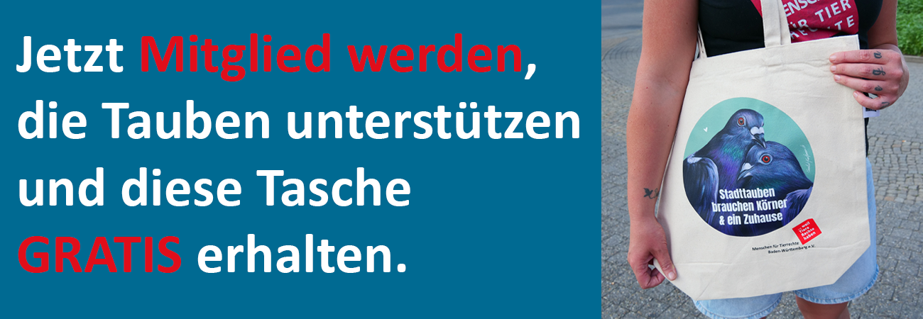 Setzen Sie ein Zeichen für Tauben und tragen Sie unsere Botschaft in die Welt! Mit Ihrer Mitgliedschaft unterstützen Sie unsere Arbeit für ein taubenfreundliches Baden-Württemberg und weitere zentrale Tierrechtsanliegen.