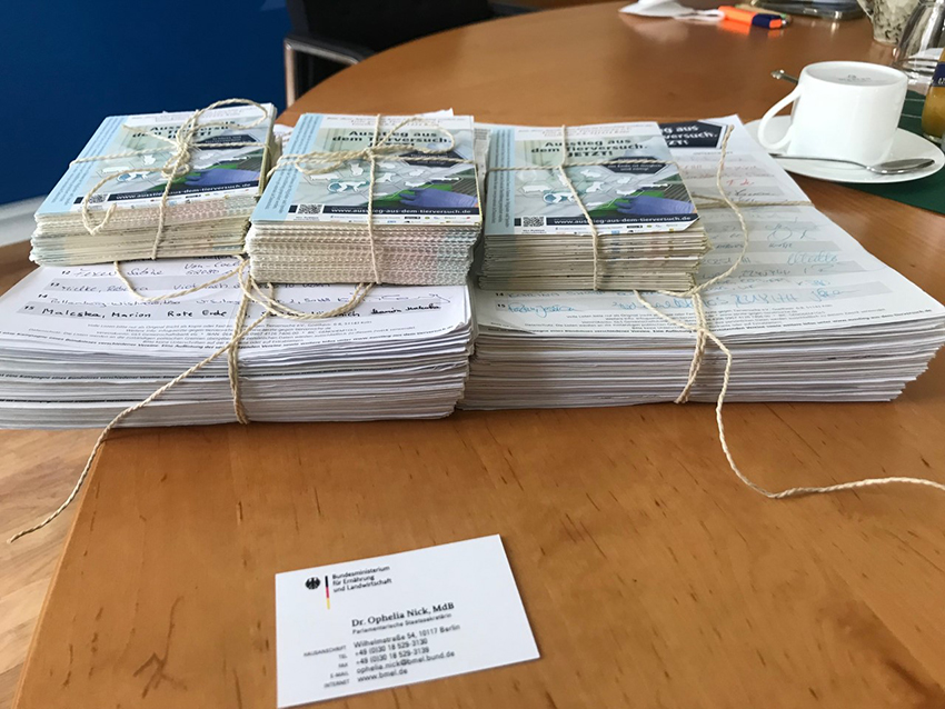 Außerdem wurden die ersten 52.000 Unterschriften einer bereits seit einem Jahr laufenden Petition an eine Mitarbeiterin des Tierschutzreferats im BMEL gegeben, zusammen mit einem offenen Brief an Bundeslandwirtschaftsministerin Julia Klöckner, in dem die zentralen Argumente und Forderungen aufgeführt sind.