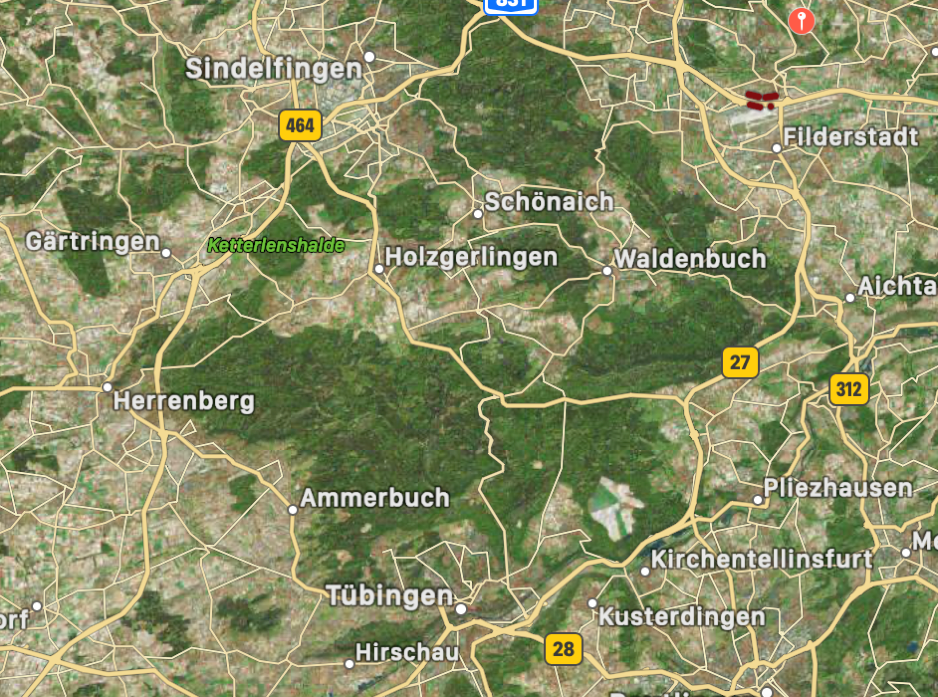 Abbildung 1: Schematische Darstellung eines mittleren bis großen Waldgebietes in Stuttgart, das zeigt, dass Wildtiere durch den Wald kaum abgeschirmt sind. Eine Störwirkung kann somit nicht ausgeschlossen werden. In stark bebauten Gebieten, wie in den Großstädten Deutschlands, also in Ballungsgebieten legt die Vermutung nahe, dass die Waldtiere teilweise stark vom Silvesterlärm betroffen sind.