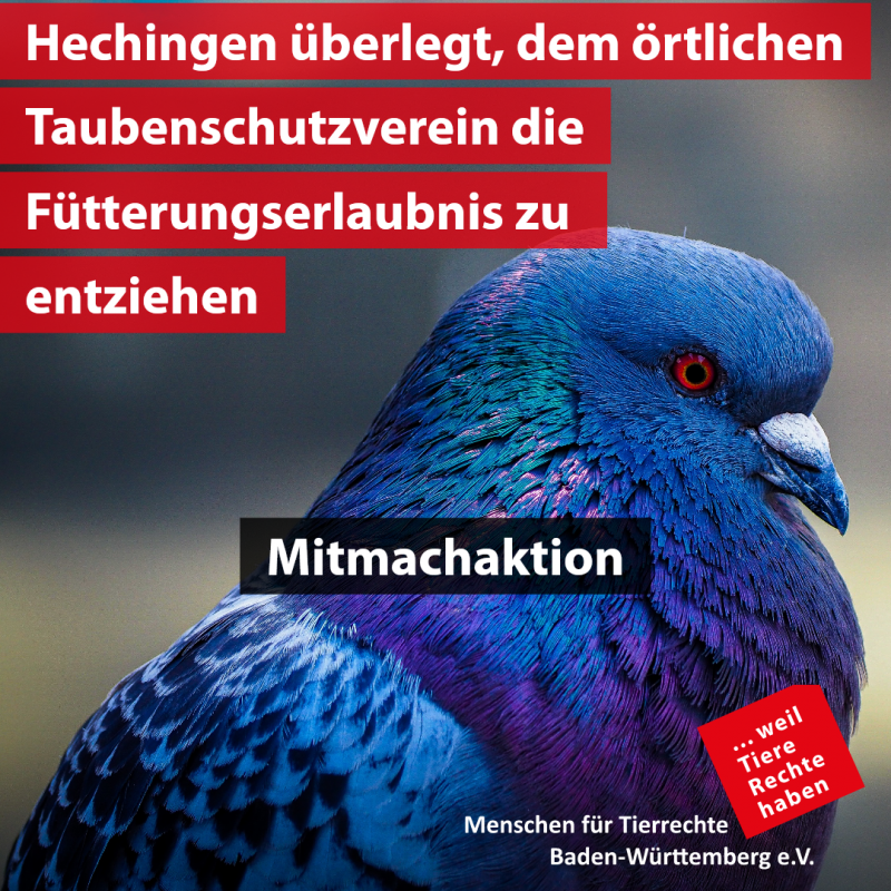 Die bestehende Fütterungserlaubnis aufzulösen, wäre ein großer Rückschritt für die Stadt Hechingen. Wir können nicht als Konsequenz aus unseren Fehlern hilflose Lebewesen leiden lassen. Sie entscheiden, ob die Stadt Hechingen ihre Verantwortung erkennt und sich für Mitgefühl stark macht. Bitte arbeiten Sie mit den engagierten Tierschützern zusammen und stellen Sie ihnen auch die finanziellen Mittel für einen Taubenschlag zur Verfügung.