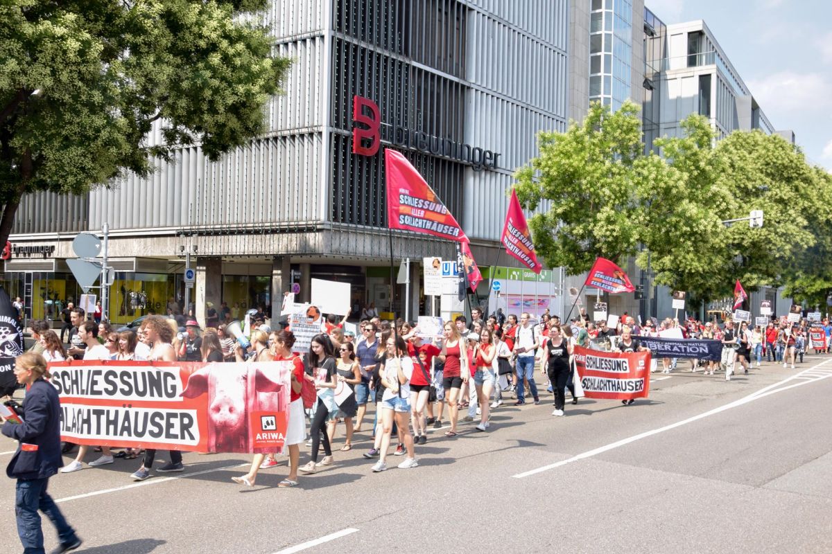 Stuttgart, 07.07.2018 - Infolge der weltweiten Bewegung für die Schließung aller Schlachthäuser gingen die Menschen an diesem Samstag erstmals auch in Stuttgart auf die Straßen, um auf die Gewalt gegen sogenannte Nutztiere aufmerksam zu machen. Schlachthäuser sind Orte des Leidens, der Angst und des Todes. Sie sind ein Teil der gesamten “Nutztierhaltung”, in der diese Tiere nichts anderes als Ware sind.