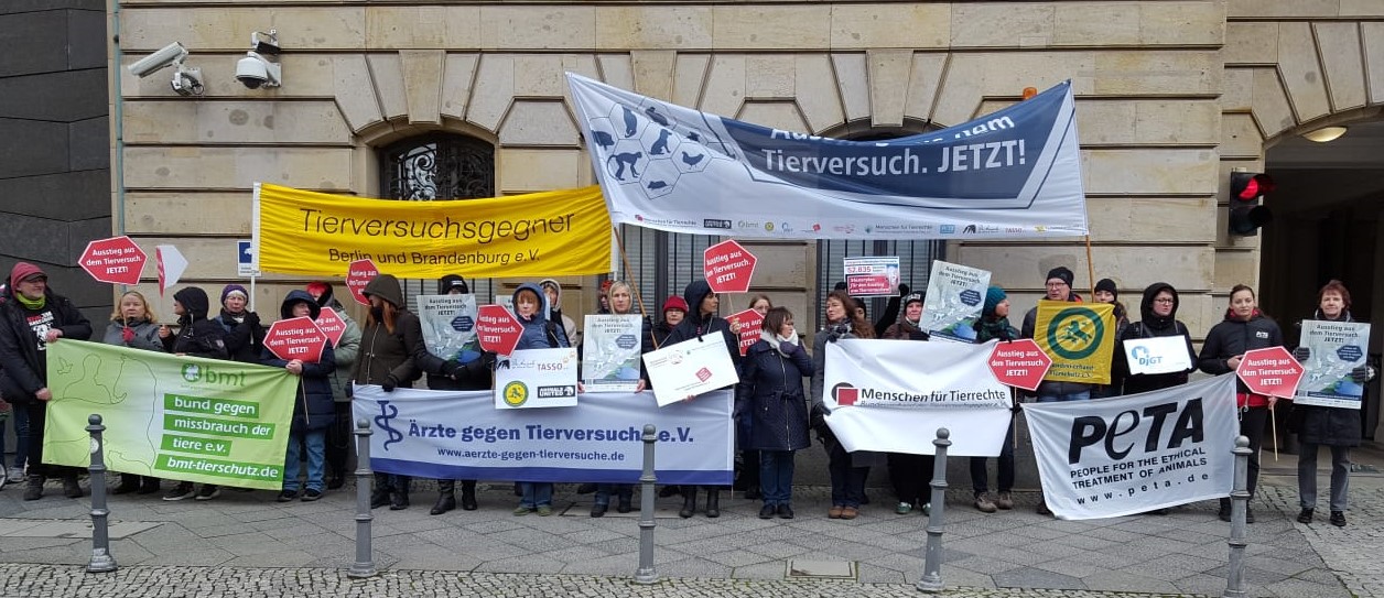Es ist eine Kampagne, die Öffentlichkeit und Politik in den nächsten Jahren beschäftigen wird: der Ausstieg aus dem Tierversuch. Mit einer medienwirksamen Aktion fiel heute vor dem Bundeslandwirtschaftsministerium der Startschuss für die Kampagne „Ausstieg aus dem Tierversuch! JETZT!“. Insgesamt 13 Tierschutz- und Tierversuchsgegnervereine haben sich hierfür zusammengeschlossen und fordern die umgehende Entwicklung eines Ausstiegskonzeptes. Darunter auch Menschen für Tierrechte Baden-Württemberg e.V.