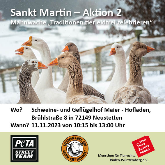 Am 8. November erschien ein umfassender Bericht über den Geflügelhof Maier im Schwäbischen Tageblatt. Darin gibt der Landwirtschaftsmeister Markus Maier Einblicke in den Ablauf des höchstens sieben Monate langen Lebens einer Gans, die für Sankt Martin und Weihnachten sterben muss. Er beteuert, dass Gänse seine Lieblingstiere sind und es sich komisch anfühlt, wenn am letzten Abend vor Weihnachten der Stall plötzlich leer ist. Menschen für Tierrechte Baden-Württemberg verweist darauf, dass in unserer modernen Zeit kein Tier mehr sterben muss, um einen Festtag zu zelebrieren oder Fleisch zu konsumieren.