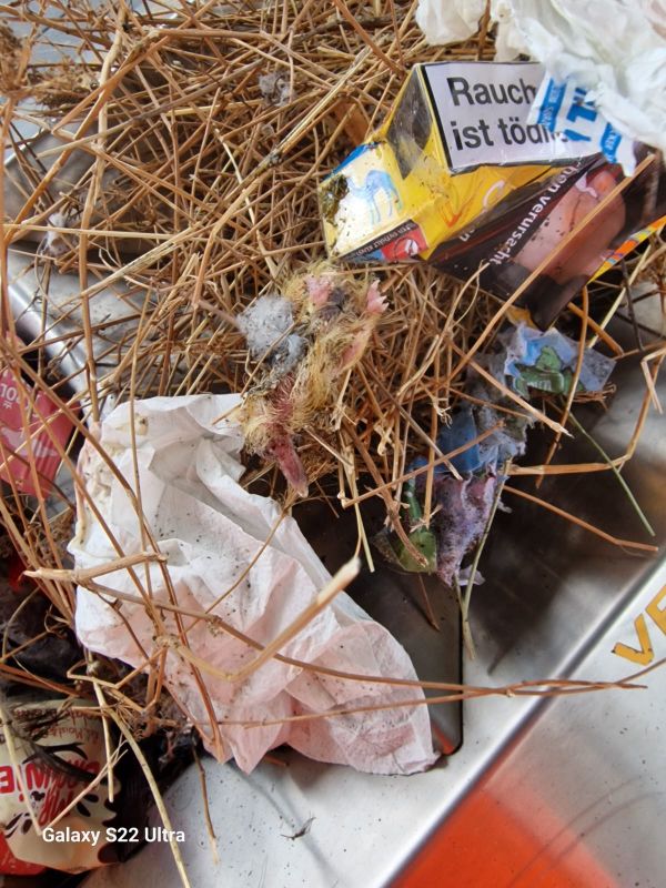 Später geht eine Freiwillige der Taubenhilfe Achern e.V. an den Bahnhof und konfrontiert den Reinigungsmitarbeiter erneut. Dieser zeigt sich weiterhin unverständlich. Außerdem macht sie Beweisfotos der mittlerweile zwei toten Küken mitsamt Nest und Ei im Müll. Auf Basis der Fotos und Zeugenaussagen stellt Menschen für Tierrechte Baden-Württemberg Strafanzeige gegen den Reinigungsmitarbeiter sowie die Deutsche Bahn. Denn der Mitarbeiter gab ja an, dass er beauftragt wurde, die Reinigung so durchzuführen. Dabei stellt dieses Vorgehen einen schweren Verstoß gegen das Tierschutzgesetz dar und ist eindeutig illegal.