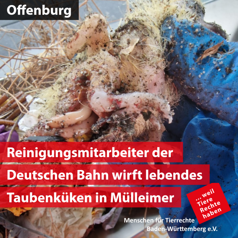 Menschen für Tierrechte Baden-Württemberg wurden Fotos übermittelt, die zeigen, dass Taubenküken inklusive Nest auf einem Bahnhof in den Müll geworfen wurden. Zusätzlich liegen Zeugenaussagen vor, die beobachtet haben, wie ein Reinigungsmitarbeiter Taubennester mit dem Besen von den Balken unter dem Vordach des Bahnhofs gefegt hat. Dabei fällt eines herunter, ein Küken stirbt sofort durch den Sturz, das andere Küken lebt. Der Mitarbeiter schmeißt das Nest mitsamt der Küken in den Müll. Auf Ansprache sagt er, dass er das so machen müsse, das wäre vorgegeben.