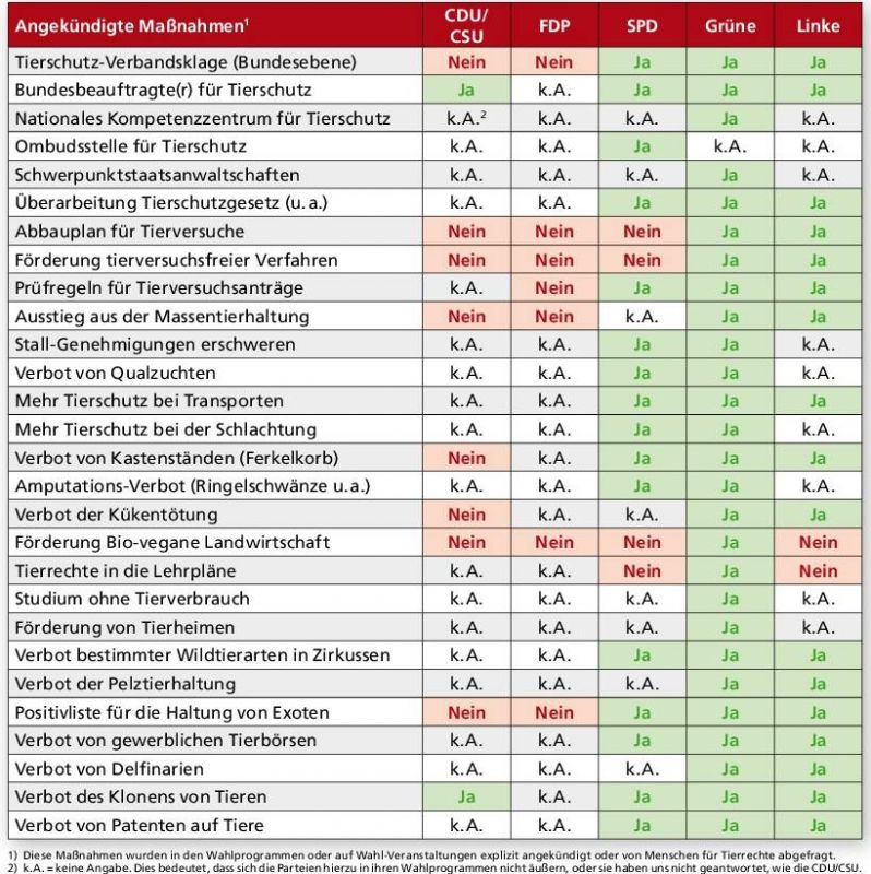 Darum hat der Verein anlässlich der im September anstehenden Bundestagswahl Wahlprüfsteine aufgestellt. Eine Übersichtsgraphik zeigt die Positionen der Parteien CDU/CSU, FDP, SPD, Grüne und Linkezu ingesamt 28 Punkten, darunter die bundesweite Tierschutz-Verbandsklage, dem Verbot von Kastenständen, einem Abbauplan für Tierversuche oder einem Verbot von Patenten auf Tiere.