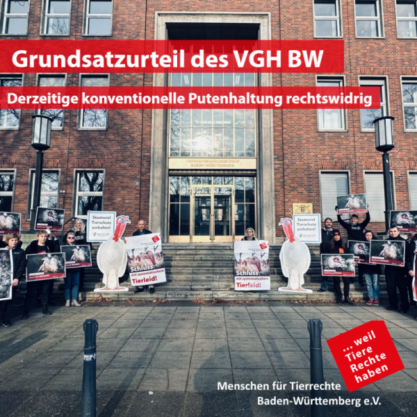 Am 7. März 2024 fand vor dem Verwaltungsgerichtshof Mannheim die weitere Verhandlung der Puten-Klage von Menschen für Tierrechte Baden-Württemberg statt. Innerhalb dieser Verhandlung wurden schockierende Details aus der Putenhaltung öffentlich. Kurz vor der Besichtigung durch die Gutachter fand ein größeres Beschädigungspicken statt, bei welchem 20 Tiere trotz gekürzter Schnäbel starben. Bei Einzeltieren konnten die Gutachter noch Spuren dieses Vorfalls erkennen. Bei der Planung der Besatzdichte im Stall plant der Landwirt immer 200 bis 300 Tiere ein, die nicht zur Mast genutzt und vorab getötet werden. Das sind kleine und schwächere Tiere sowie weibliche Tiere, die fehlerhaft einsortiert wurden. Der Betrieb mästet nämlich ausschließlich männliche Tiere. Für die 5.900 Puten im Betrieb gibt es vier Strohballen Beschäftigungsmaterial. Der vom Gericht geladene Gutachter bezeichnete die Haltung als akzeptabel, warf aber gleichzeitig ein, dass die Putenhaltung ein rechtsfreier Raum ist.