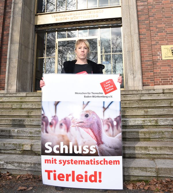 Gemeinsam mit der Albert Schweitzer Stiftung hielt Menschen für Tierrechte Baden-Württemberg am Donnerstag, den 8. März, von 9 bis 10 Uhr eine Mahnwache vor dem dem Verwaltungsgerichtshof Mannheim. Anschließend startete die Verhandlung der Klage gegen den Landkreis Schwäbisch Hall, weil das zuständige Veterinäramt nicht in eine tierschutzwidrige Putenhaltung eingeschritten war und daraufhin wegen Untätigkeit von Menschen für Tierrechte Baden-Württemberg verklagt wurde.