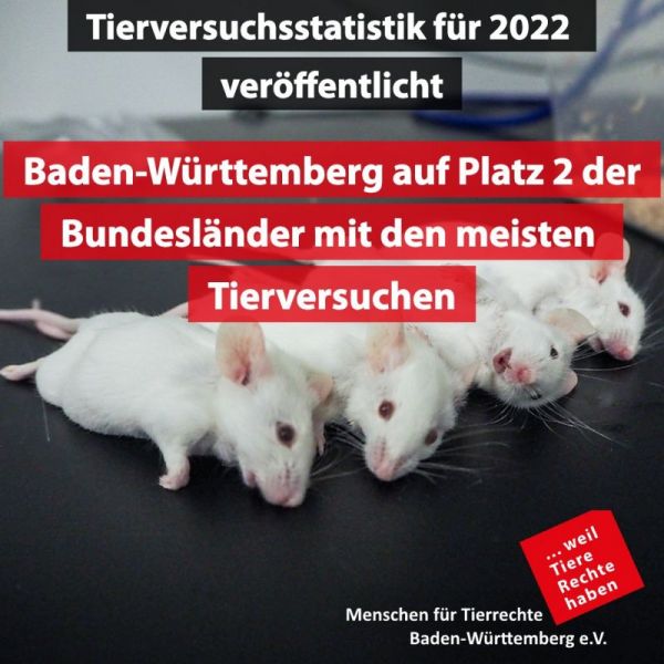 Laut der vom Bundesinstitut für Risikobewertung (BfR) im Auftrag des Bundesministeriums für Ernährung und Landwirtschaft veröffentlichten Tierversuchsstatistik 2022 liegt Baden-Württemberg auf Platz zwei der Bundesländer, welche 2022 die meisten Tiere in Tierversuchen einsetzten. Bayern bleibt auch wie im Jahr zuvor auf Platz eins mit 774.874 Tieren und damit 18,42 % der deutschlandweiten Gesamtzahl von 4.207.231 Tieren. Baden-Württemberg belegt mit 644.408 Tieren (15,32 %) den zweiten Platz, ebenso wie letztes Jahr. Seit 2021 sind sogenannte Überschusstiere in diesen Zahlen enthalten. Das sind Tiere, die wegen fehlendem Verwendungszweck getötet werden, ohne im Tierversuch eingesetzt worden zu sein. In Baden-Württemberg waren das erschreckende 283.365 Tiere, die wie Wegwerfware sterben mussten (1).
