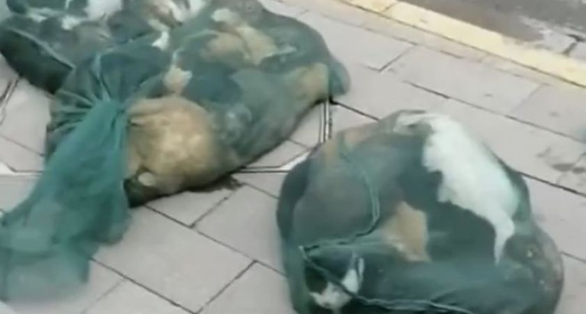 lebende Katzen in verschlossenen Plastiksäcken sieht , die zur Vermeidung von einer Covid 19 Infektion