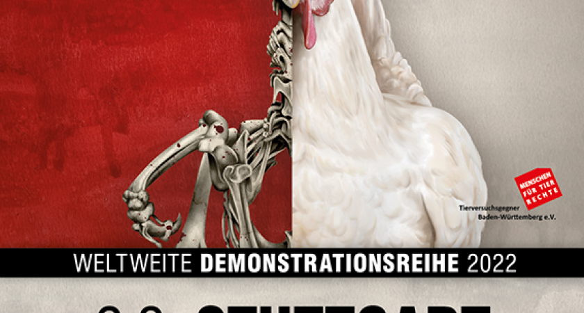 Am Beispiel der Hühner verdeutlichten wir dieses Jahr das Leid aller ‚Nutztiere`. Allein 700 Millionen dieser Tiere sterben jedes Jahr in deutschen Schlachthäusern: meist als Kleinkinder nach wenigen Wochen Turbomast für die Fleischindustrie oder als „ausgediente Legehennen“ in kaputten, ausgelaugten Körpern. Denn auch in der Eierindustrie wartet am Ende immer ein grausamer Tod.