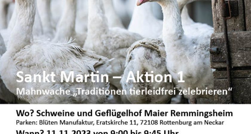 Vertreter*innen und Unterstützer*innen der Tierrechtsorganisationen Menschen für Tierrechte Baden-Württemberg, PETA und Animal Save halten am Samstag, den 11. November 2023 von 9 bis 9:45 Uhr eine friedliche Mahnwache bei den Gänsen und Schweinen des Geflügelhof Maier Remmingsheim. Adresse für Anfahrt: Blüten Manufaktur, Eratskirche 11, 72108 Rottenburg am Neckar. Von dort sind es fünf Minuten Fußweg zu den Gänsen und Schweinen. Anschließend geht es weiter zum Hofladen (Brühlstraße 8 in 72149 Neustetten). Vor diesem wird von 10:15 bis 13 Uhr demonstriert. Es wird Redebeiträge geben und Interessierte als auch die Presse sind eingeladen, die Veranstaltung zu unterstützen oder darüber zu berichten.