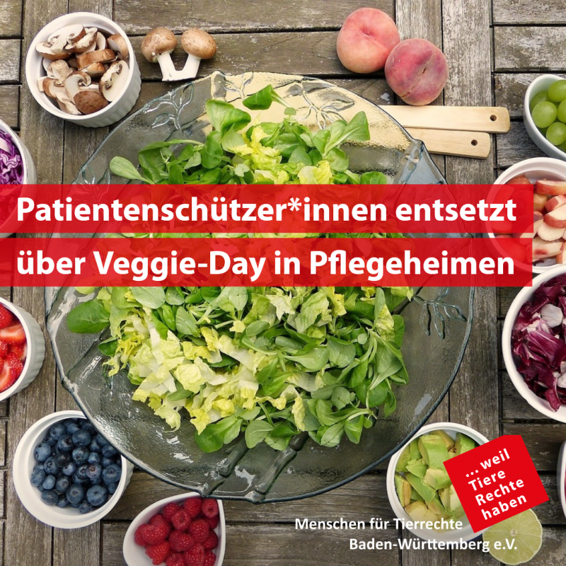 Menschen für Tierrechte Baden-Württemberg ist überrascht oder gar entsetzt, dass gerade Patientenschützer*innen sich massiv gegen einen Veggie-Day in Pflegeheimen in Baden-Württemberg wehren (1). Aber es scheint, dass wo immer überhaupt nur die Idee einer vegetarischen Mahlzeit aufkommt, sich sofort jede*r in seiner Freiheit beschnitten fühlt.