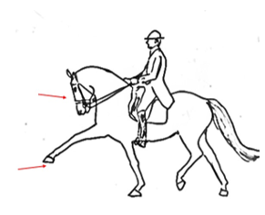 Hierher gehört der gesamte Komplex der Hyperflexion, der Rollkur: Für den Laien sieht der runde Hals schön aus und die daraus resultierenden krampfhaften Vorhandbewegungen sind eindrucksvoll. Die Abbildung nebenan verdeutlicht das: Man kann sehen, dass die Stirnlinie hinter der Senkrechten ist (oberer Pfeil) und dass das Vorderbein nach oben gerissen wird (unterer Pfeil). Es gibt noch eine ganze Reihe weiterer Kennzeichen und Probleme, die ich hier aber nicht alle aufführen möchte, damit es nicht zu kompliziert wird. Eine solche Position von Kopf Hals und Vorderbein ist aber immer verdächtig. Man kann das nicht erreichen, wenn man pferdeschonend ergonomisch reitet.
