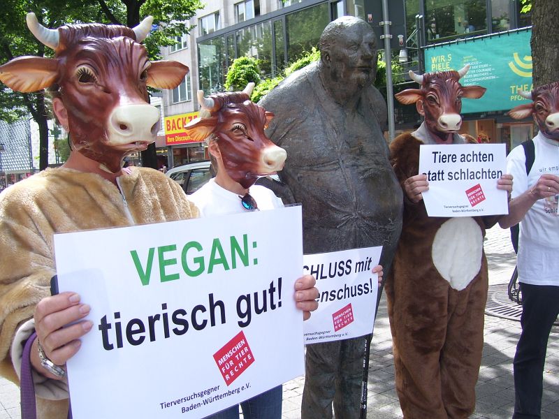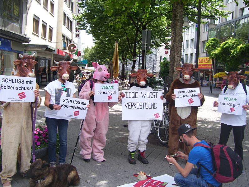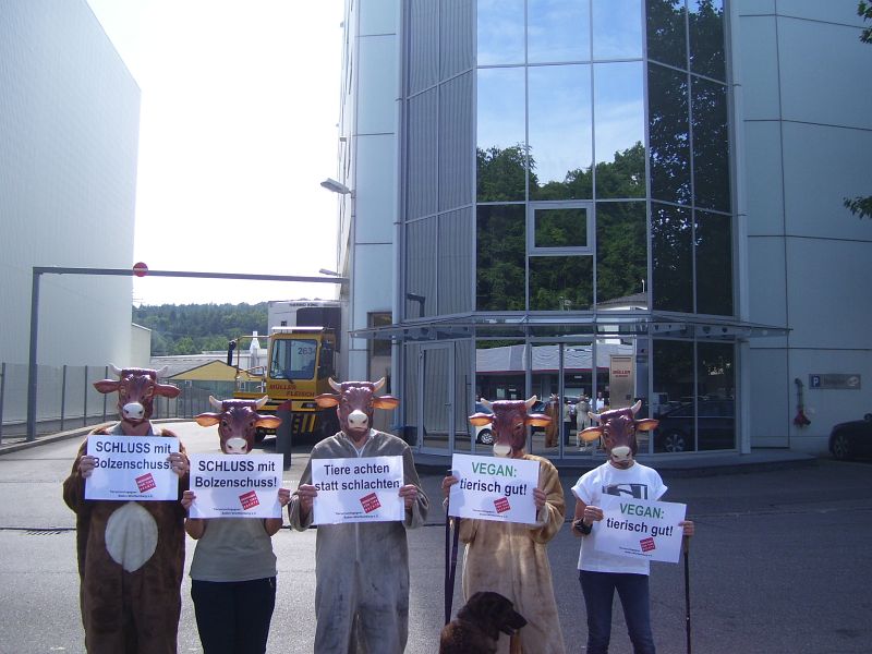 Wir unterstützen die internationale Kampagne Schließung aller Schlachthäuser, die von der Organisation L214 ins Leben gerufen wurde und organisieren diesbezüglich auch immer wieder Aktionen vor Schlachthäusern. Trotz zahlloser gewichtiger ethischer Argumente ist ein Ende des Schlachtens derzeit aber weder politisch noch gesellschaftlich durchsetzbar. Um dennoch möglichst vielen Tieren Schmerzen und Leiden zu ersparen, setzen wir uns daher auch dafür ein, dass die Fehlbetäubung von Millionen Tieren im Jahr in deutschen Schlachthöfen beendet wird.