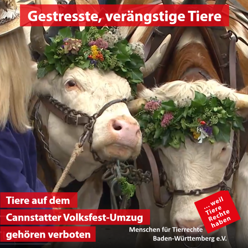 Der Umzug ist gleichermaßen spannend und abwechslungsreich, aber wir appellieren daran, dass dieser auch ohne Tiere funktionieren kann und muss. Tiere im Namen der Tradition unter dermaßen stressigen Umständen zu nutzen, ist nicht mehr zeitgemäß. Pferde und Ochsen könnten ganz einfach ersetzt werden z.B. durch motorisierte „Vintage“-Fahrzeuge (schließlich ist Stuttgart weltbekannt für seine langjährige Automobil-Industrie). Niemand muss heute noch Tiere mitlaufen lassen.
